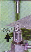 | ●ファスナーダイレクト供給方式 通常の自動かしめ機は、ワークを位置決めピンにさして、上部から ファスナーを供給・挿入していきますが本機はファスナーを下から 供給し、供給されたファスナーにワークを直接位置決めする 「ファスナーダイレクト供給方式」を採用しております。この弊社独自 方式により、ファスナーの供給・挿入ミスを作業者が目視で確認 することができ、製品の破損を未然に防ぐことができます。 |